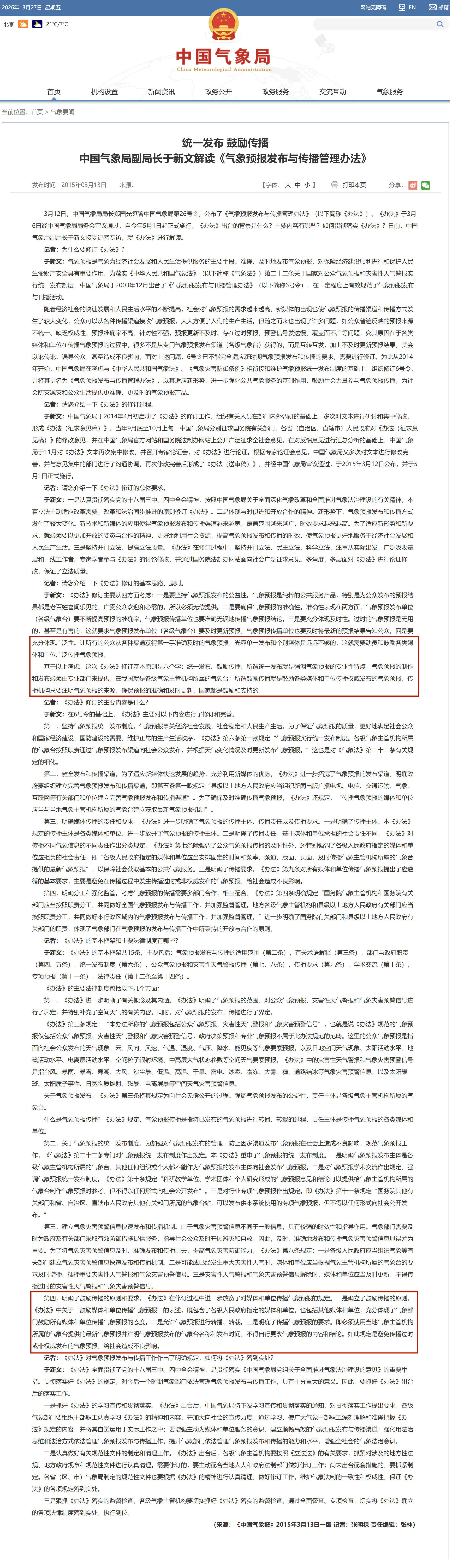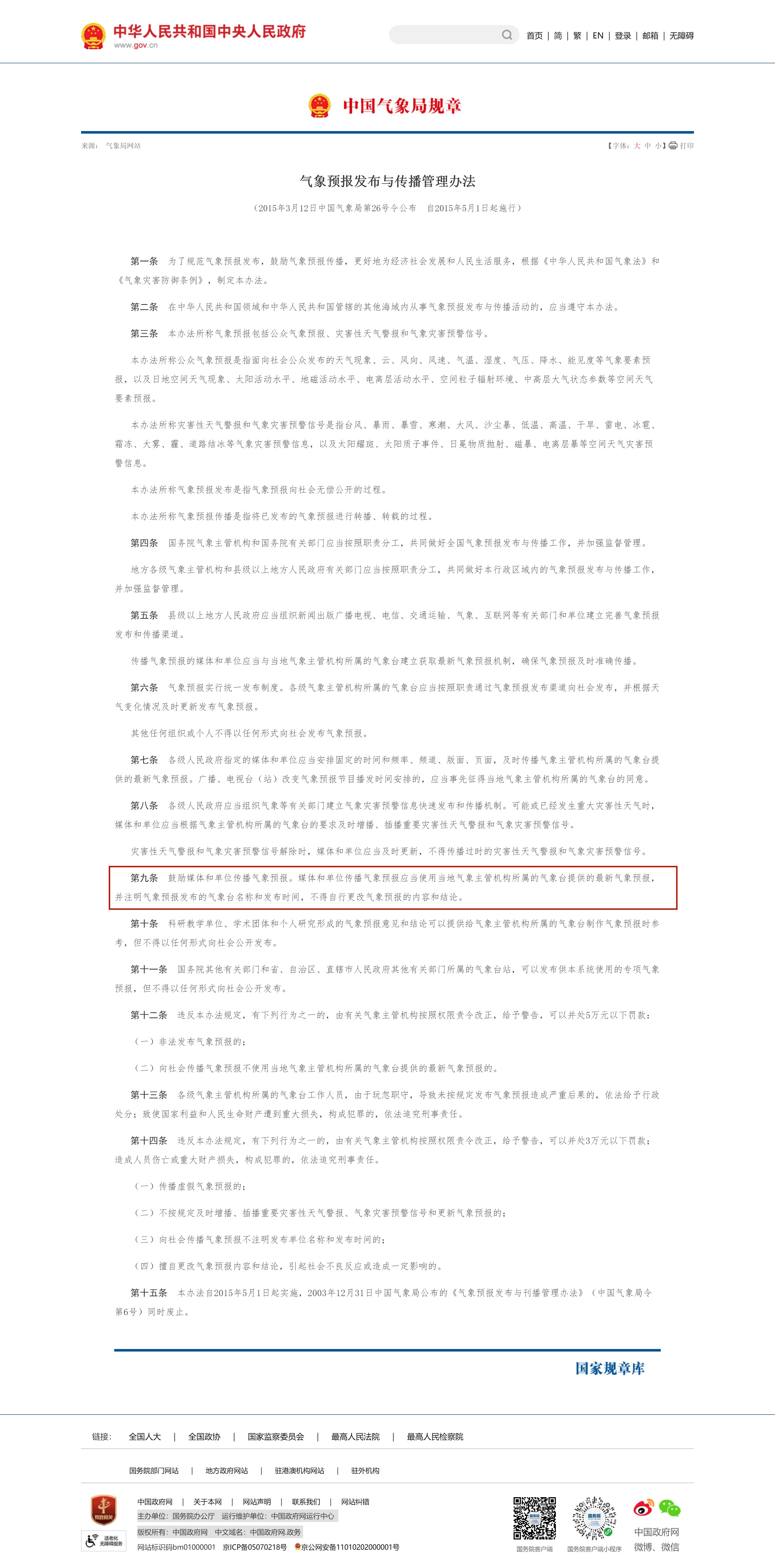 此外,2015年3月12日中国气象局第26号令公布的《气象预报发布与传播管理办法》第九条规定:鼓励媒体和单位传播气象预报。媒体和单位传播气象预报应当使用当地气象主管机构所属的气象台提供的最新气象预报,并注明气象预报发布的气象台名称和发布时间,不得自行更改气象预报的内容和结论。