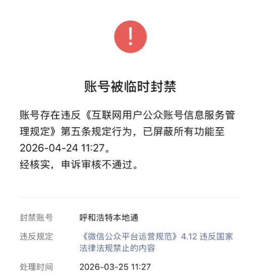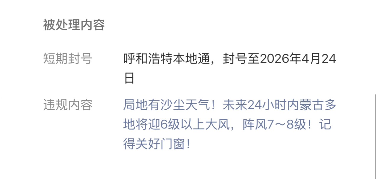 因此,恳请平台依据国家法律法规及中国气象局官方规范,重新审核本次违规判定,撤销对 “呼和浩特本地通” 公众号的功能限制,恢复账号正常使用。