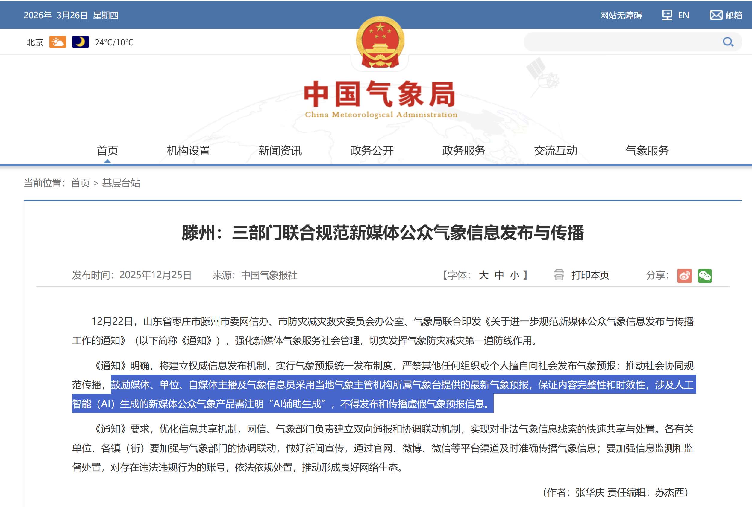 中国气象局官网在2025年12月25日发布的标题为《滕州:三部门联合规范新媒体公众气象信息发布与传播》内容显示:鼓励媒体、单位、自媒体主播及气象信息员采用当地气象主管机构所属气象台提供的最新气象预报,保证内容完整性和时效性,涉及人工智能(AI)生成的新媒体公众气象产品需注明“AI辅助生成”,不得发布和传播虚假气象预报信息。
