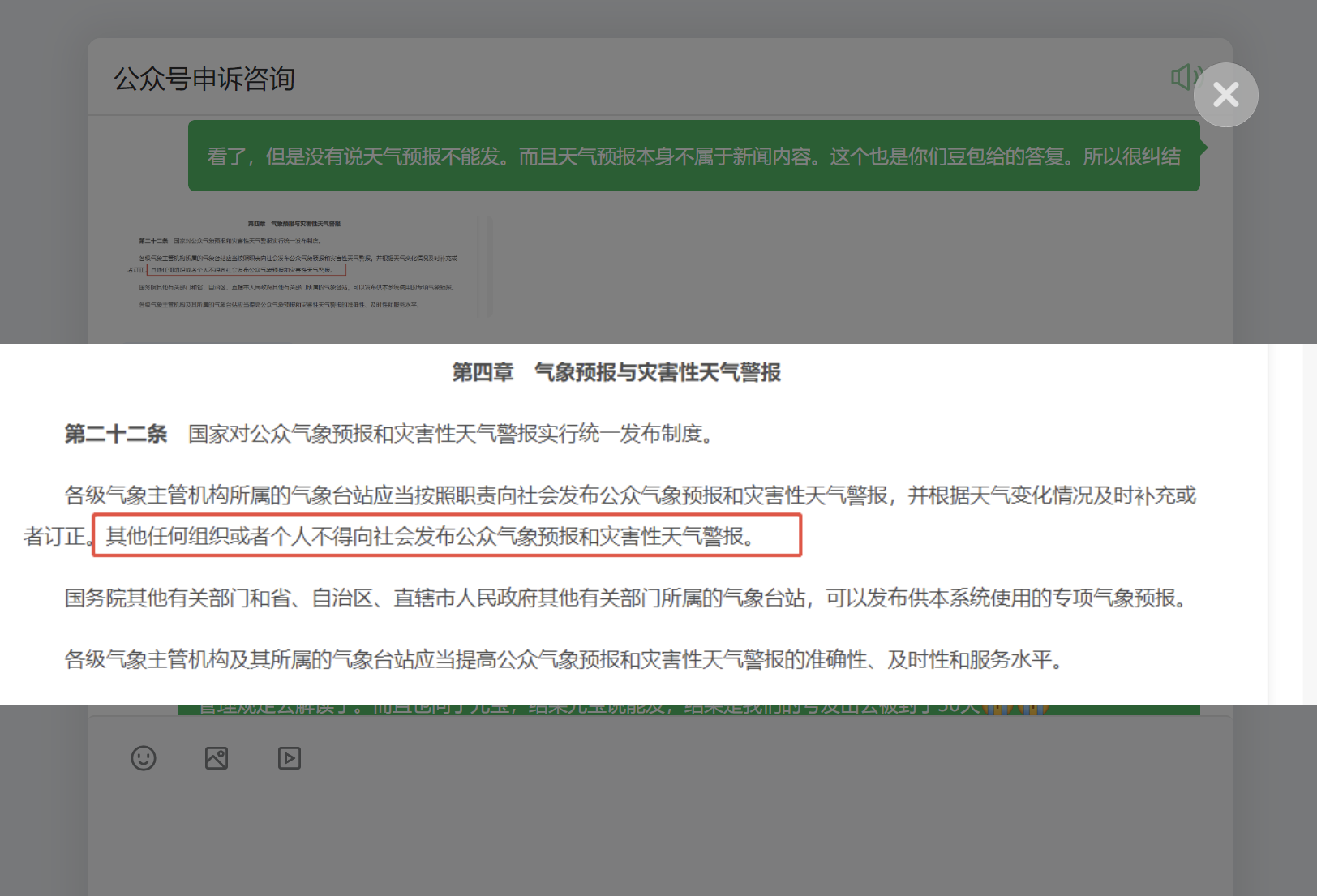 对于腾讯官方客服给出的判定违规理由,我们认为平台存在性质认定错误:我方为合法转载官方气象预警,绝非 “擅自发布” 气象预报。《气象法》第22条仅禁止 “其他任何组织或者个人向社会发布公众气象预报”,并未禁止合法传播(转载)官方已发布的气象预警信息;而《气象预报发布与传播管理办法》第 9条明确鼓励媒体、单位(含自媒体)传播气象预报,只需满足 “使用官方最新信息、标注来源、不篡改内容” 即可。