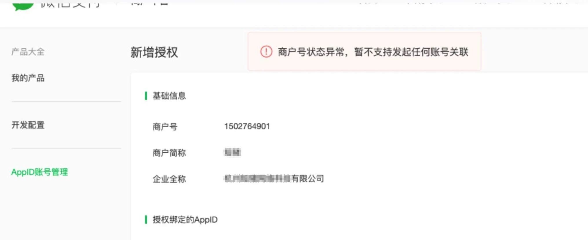微信支付在授权绑定的appId的时候,其中的 AppId认证主体,提示我商户号状态异常,暂不支持发起任何账号关联。具体是什么原因引起的?有什么解决办法。