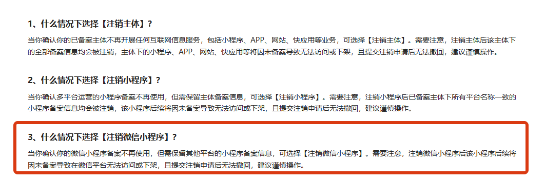 这种情况需要注销小程序备案,注销的时候选择【注销微信小程序】,影响最小,只是注销小程序的备案号。