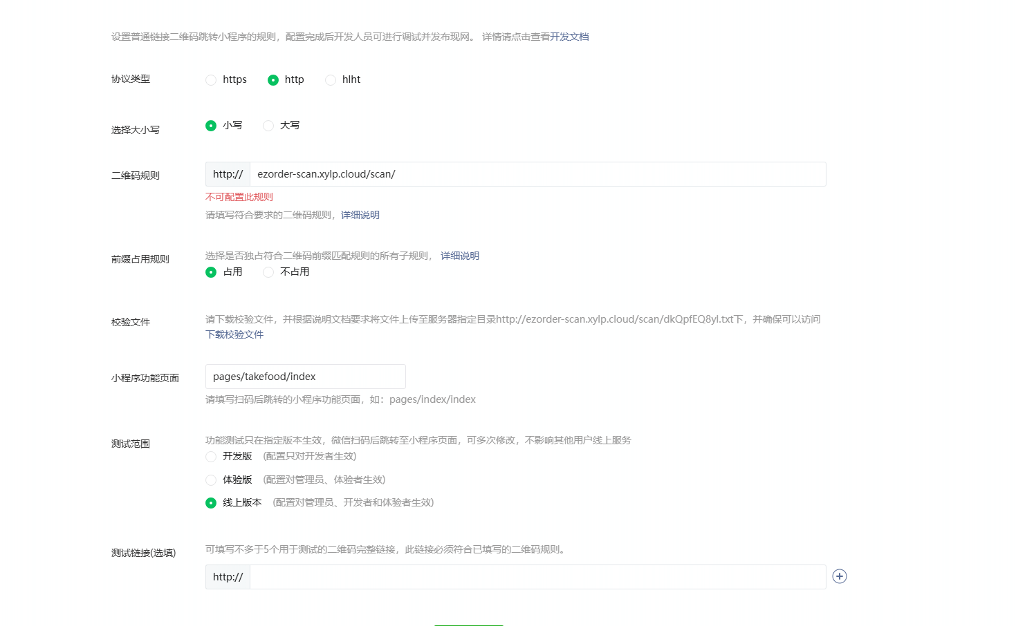 之前另外一个小程序配置过xylp.cloud一级域名规则,然后我删除了,配置ezorder-scan.xylp.cloud到wxbb02ecad074aa48f小程序就报错,一直配置不上去