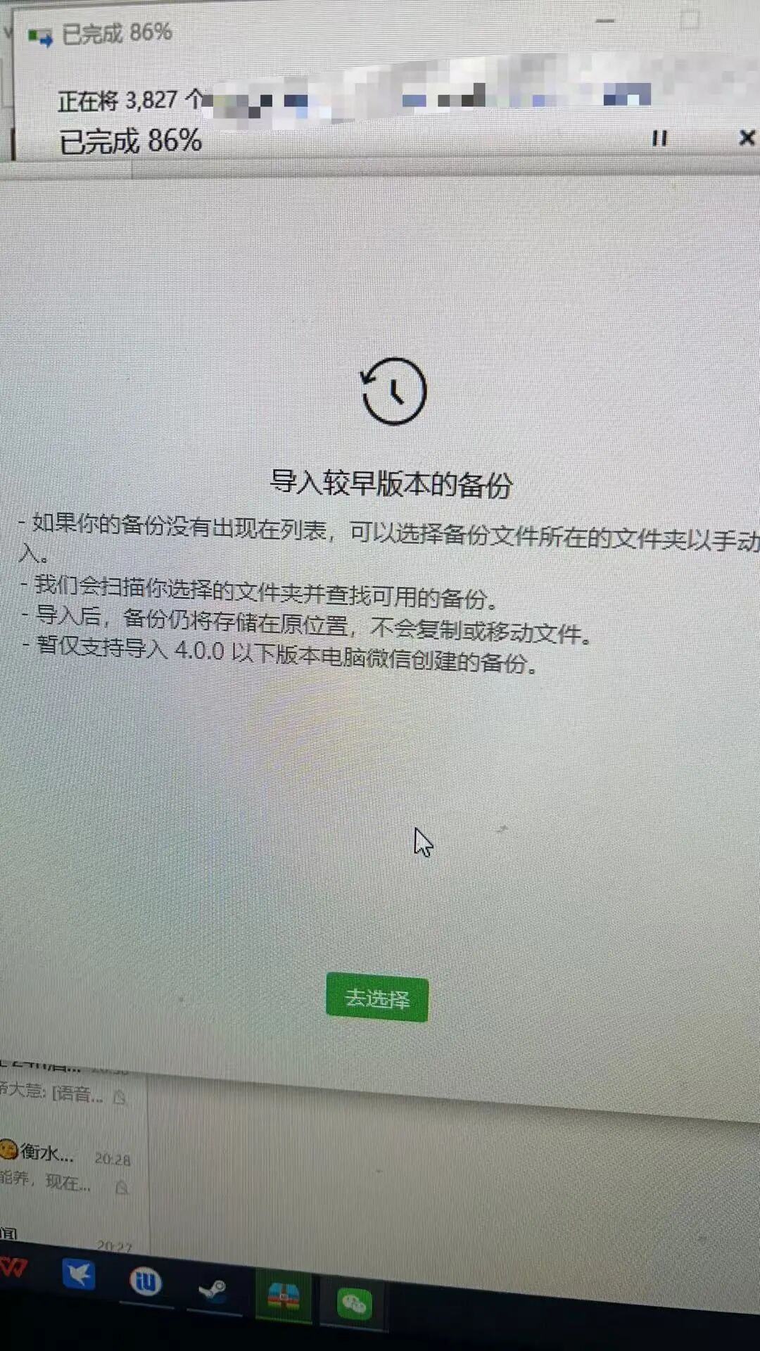 微信电脑版本更新到4.1版本以后,备份聊天记录后,将备份的聊天记录相关文件及文件夹复制到其他电脑同版本微信恢复,无法恢复。提示无备份的聊天记录,且在导入之前的备份里只能导入4.0.0以下版本备份的微信聊天记录。请问这个怎么解决?因为只保留了BackupFiles文件夹,其他的都删了。。原电脑重装系统了,也显示没有过备份。