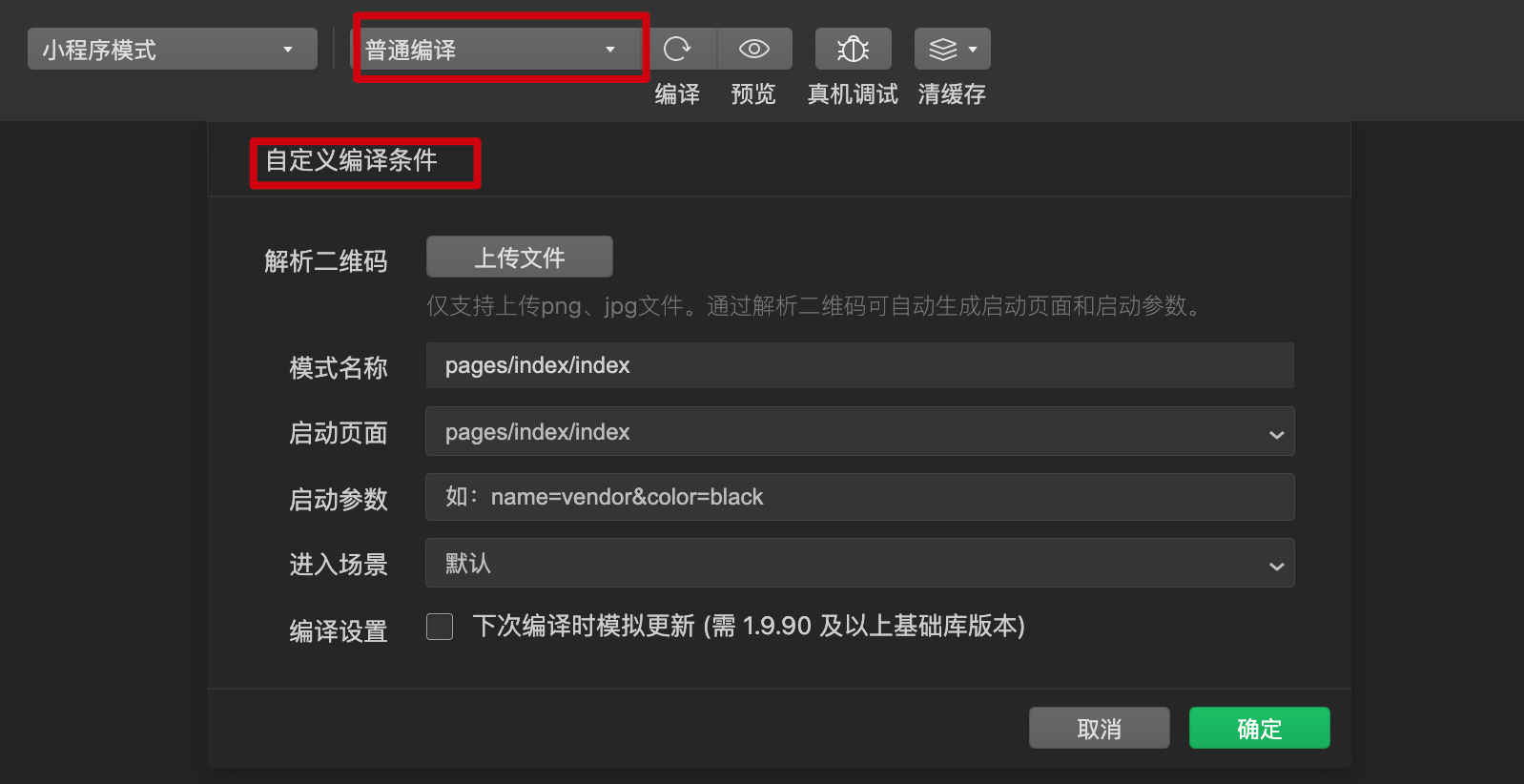 开发工具添加的编译模式 都在这个对象里自动生成配置,对应,插件模式,小程序模式,小游戏模式等。