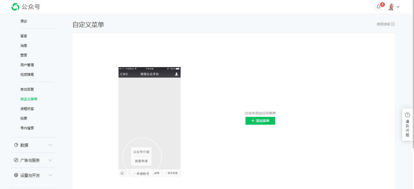 【页面链接】: https://mp.weixin.qq.com/cgi-bin/home?t=home/index&lang=zh_CN&token=111706133https://mp.weixin.qq.com/advanced/selfmenu?action=index&t=advanced/menu-setting&token=111706133&lang=zh_CN