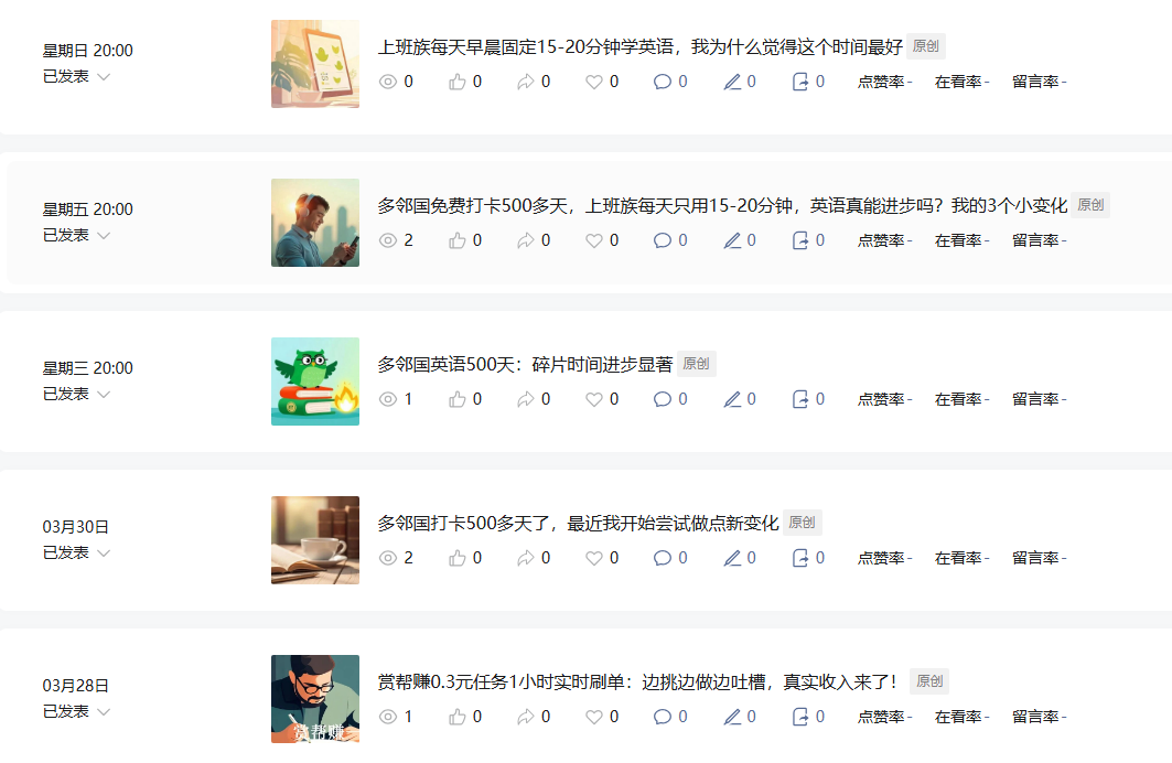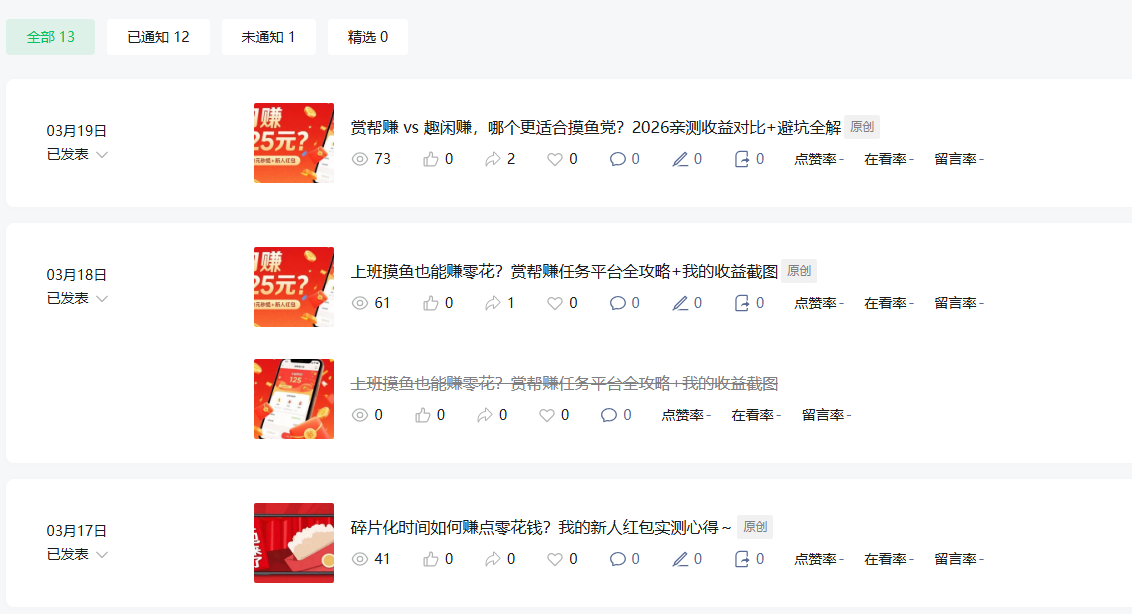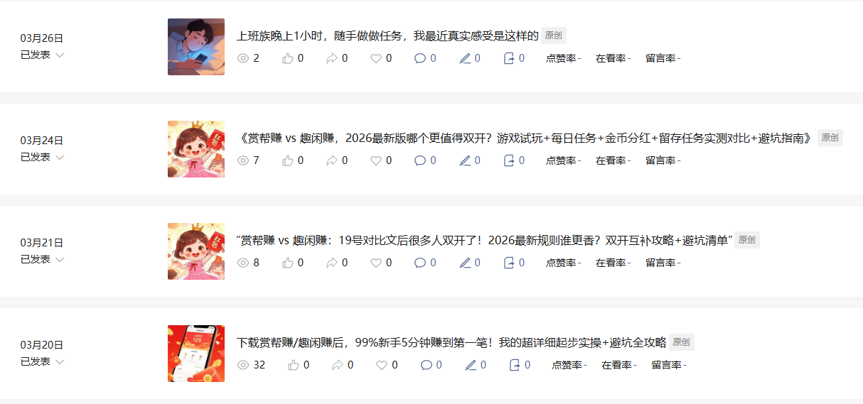 你好我的公众号之前发布赏帮赚、趣闲赚等任务平台真实测评内容时,搜一搜有50-80阅读吧。 但从3月底尝试切换多邻国英语学习内容后,阅读量直接掉到0-2无任何违规通知。账号非常新,第一篇内容是3月17号发的。 现已优化简介并计划回归零花钱任务真实分享方向,希望官方帮忙查看是否隐形限流,以及如何恢复搜一搜推荐权重。多谢~~~