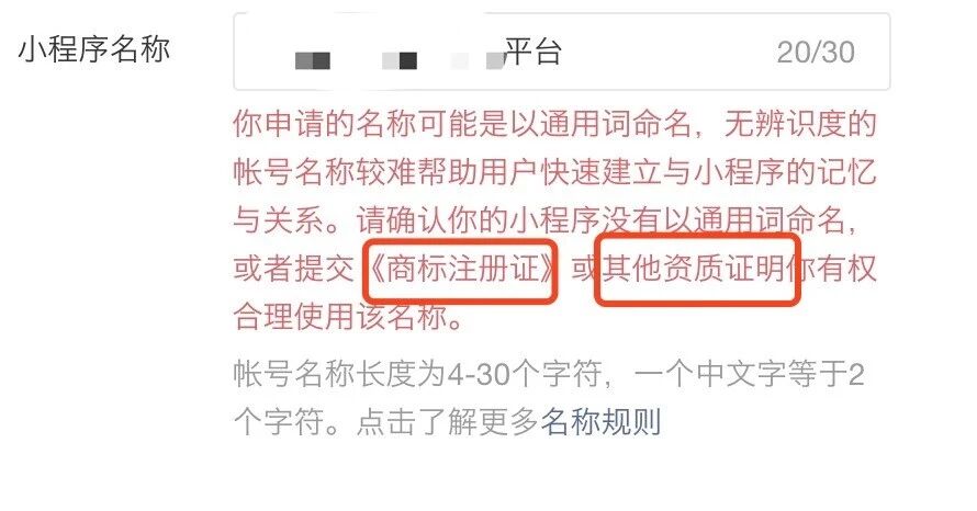 你好,平台认为每个小程序的命名都应该有一定的辨识度,建议选具有辨识度的短词作为小程序的名称,具体名称规则可参考:https://developers.weixin.qq.com/community/operate/doc/00060288824708b8d588e4ae25bc01