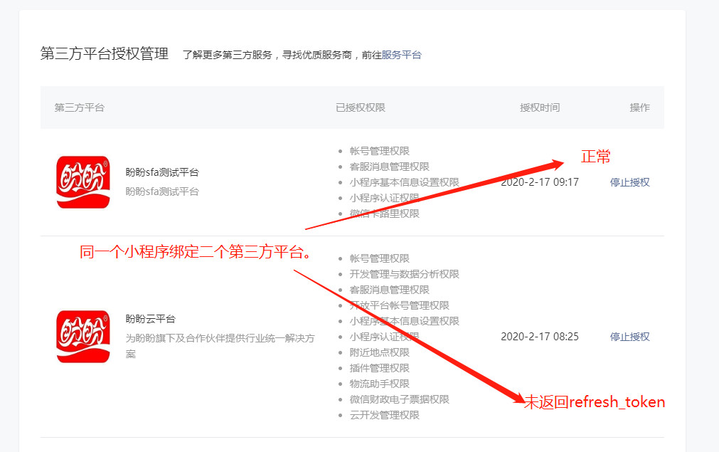 同一个小程序,绑定2个第三方平台,第一个成功,第二个不成功,开始怀疑是第二个第三方平台的问题,结果也测试了下,第二个接管其他小程序,也是成功的
