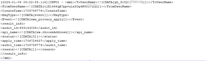 场景:我们是小程序服务商的平台,授权过来的小程序需要开通2个地理位置接口wx.chooseAddress和wx.getLocation,接口审核结果将会通过消息推送到我们的接口,我们进行后续操作。