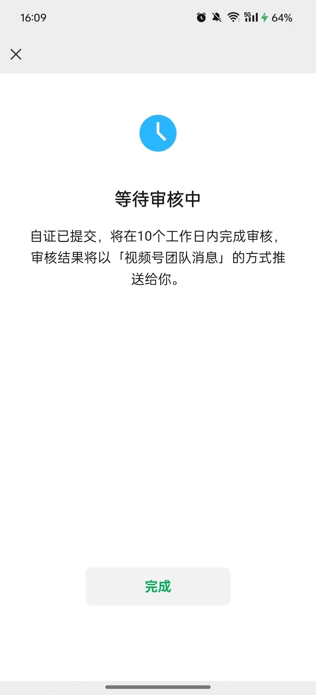 老板扫了那个二维码,直接跳出这个界面,是扫码了就直接审核,还是有其他流程,为什么要审核没有其他的显示,直接跳出自证已提交的画面,那么我和老板都扫了这个二维码,会不会对这个审核有影响,这个视频号的账号是老板创造的,信息都是他本人的。