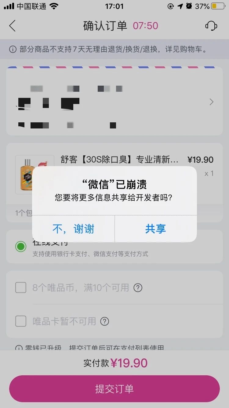 切到别的app后,放了一段时间,再看的时候突然弹出微信已崩溃,没有做什么特别的操作。