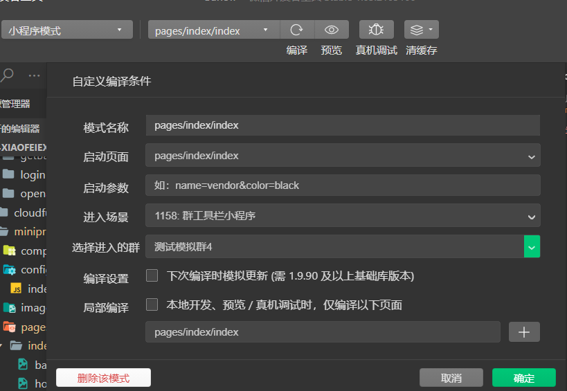 我用微信开发者工具 设置启动场景 "1158: 群工具栏小程序", 并且已经选择使用"测试群聊x",调试基础库已升至2.20.0