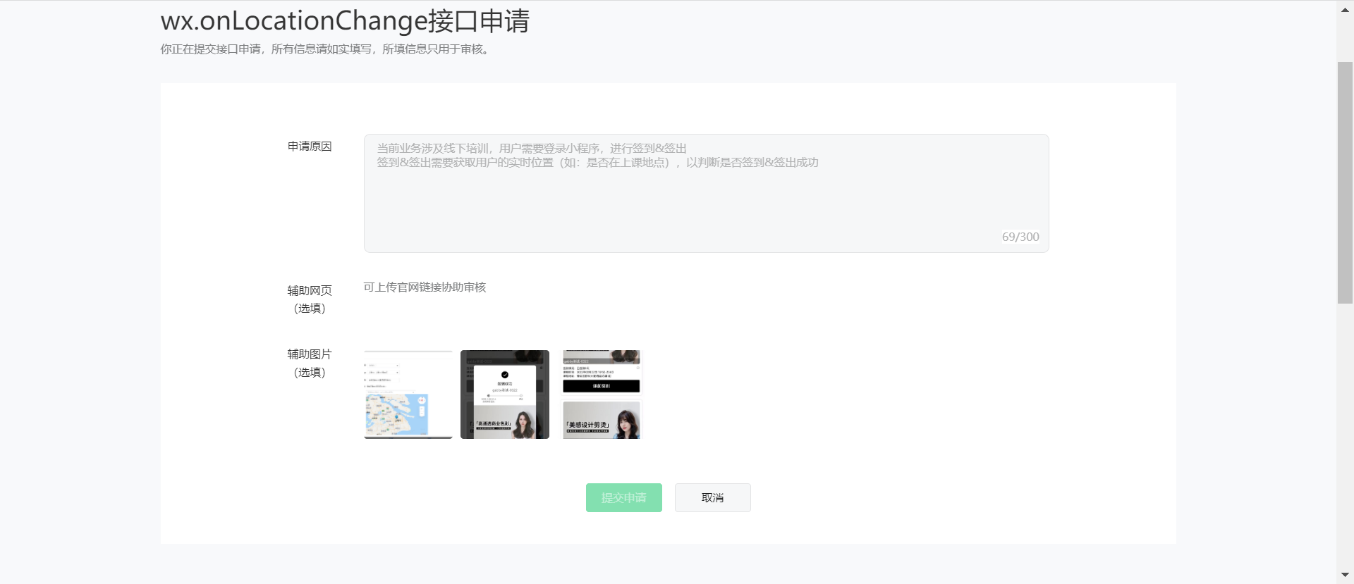 你好,核实到小程序申请wx.onlocationChange接口审核不通过,根据提交的申请信息可知申请该接口是用于【实时签出签入服务】,未含有需监听用户实时运动轨迹的使用场景,不符合wx.onlocationChange接口使用场景开放范畴。建议申请wx.getLocation也可实现上述业务场景。