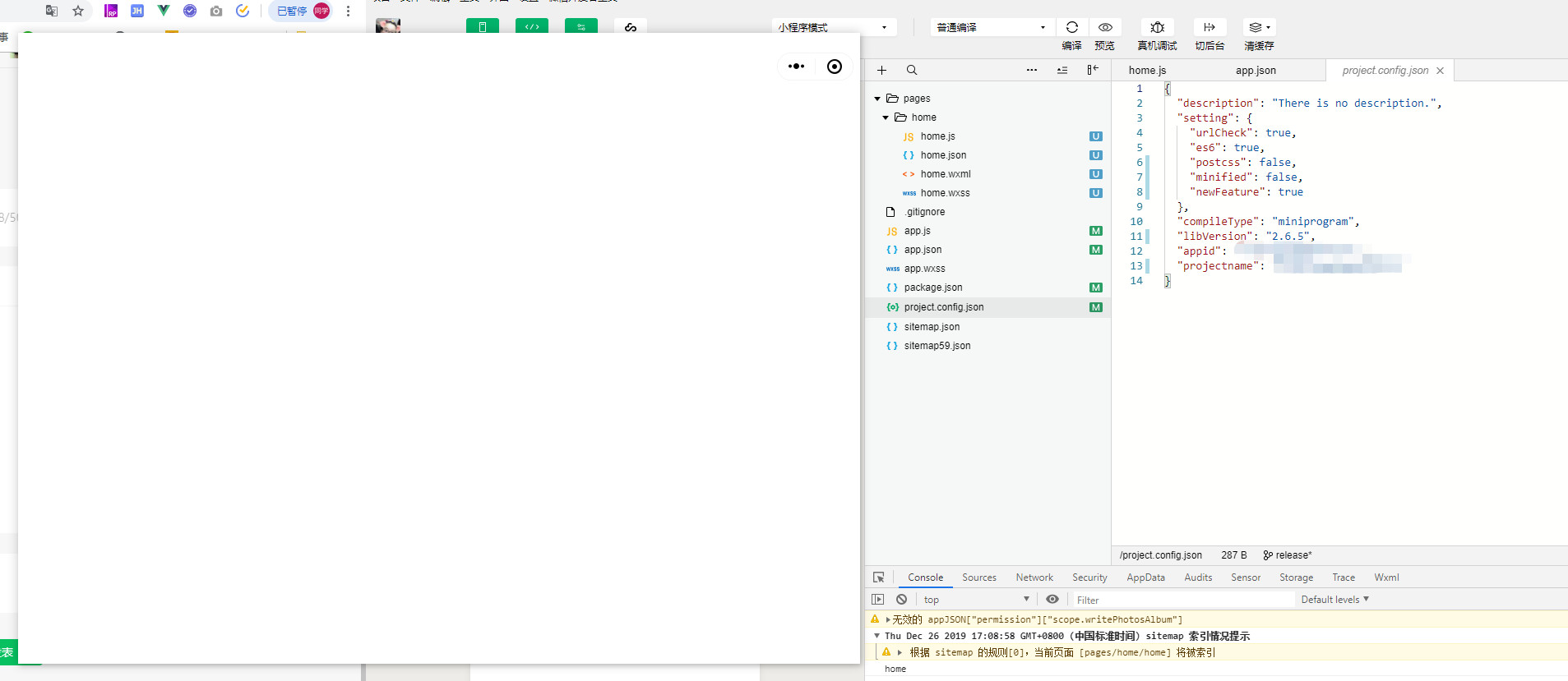 左侧为弹框,右侧为代码结构,只有一个pages/home/home