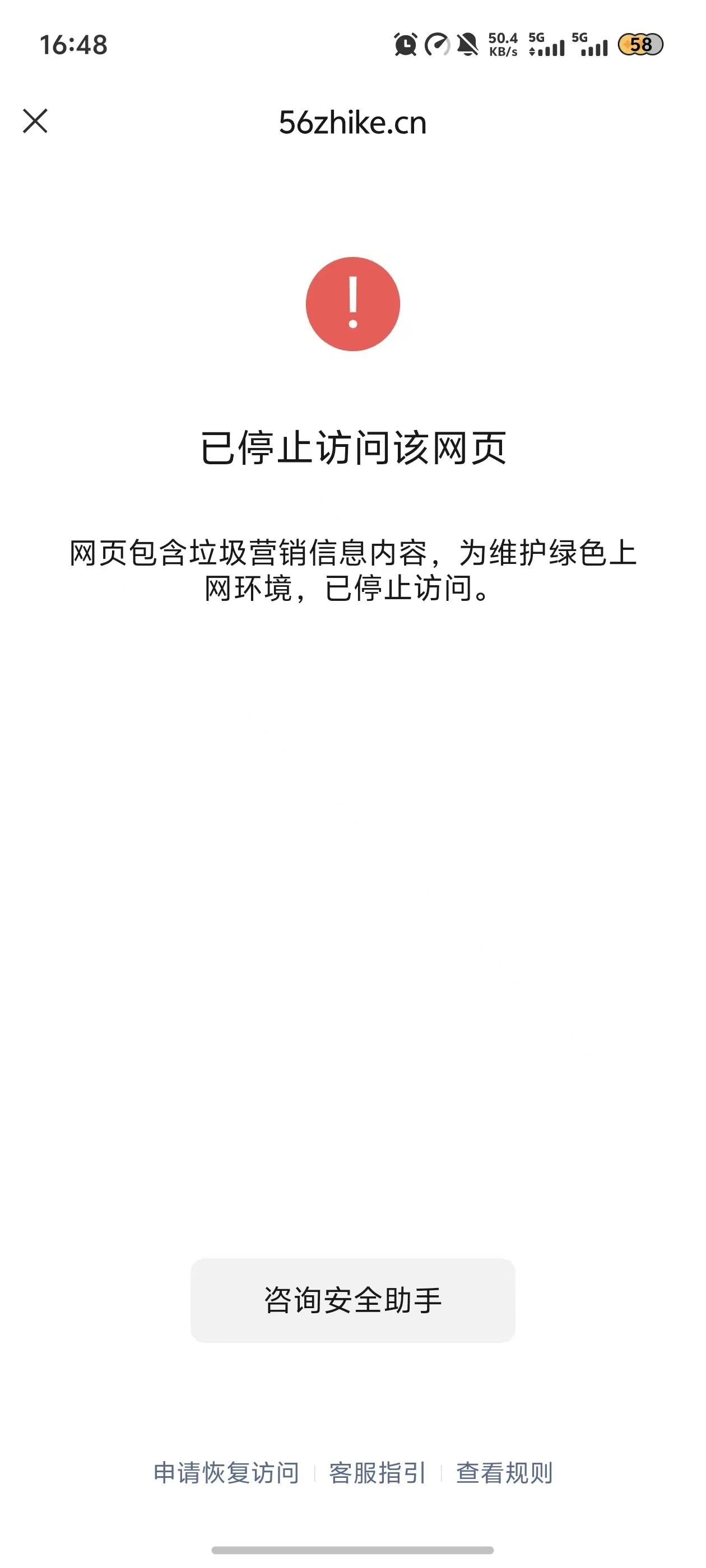56zhike.cn是我司活码业务所使用域名。但是网站提示需要点击继续访问才可以访问,网站主要是便于商家私域获客,我司积极自查,上次提交申诉后反馈违规链接已经整改,网站没有违规行为,希望可以可以重新审核。