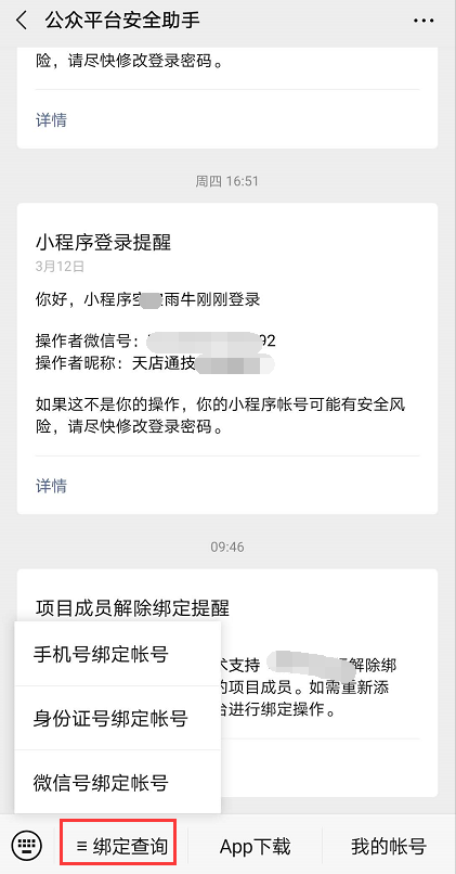 可以搜索“公众平台安全助手”查询绑定的管理员身份。