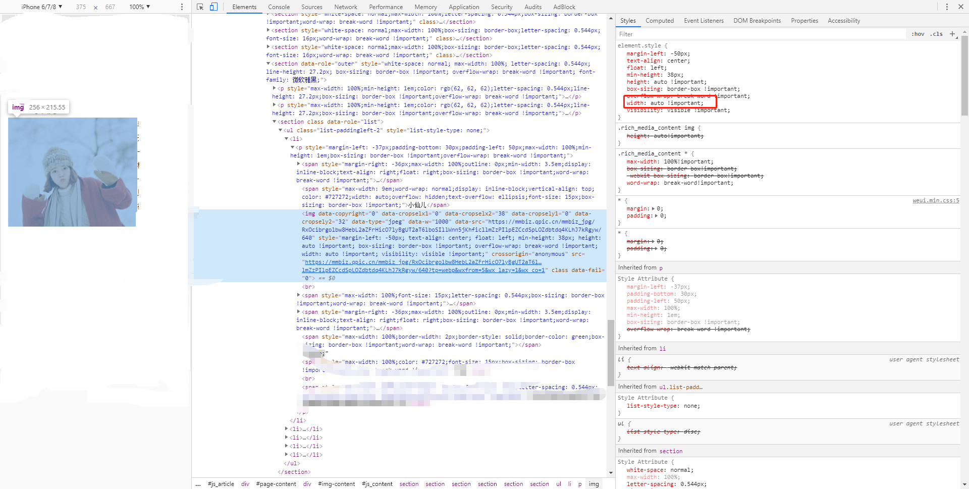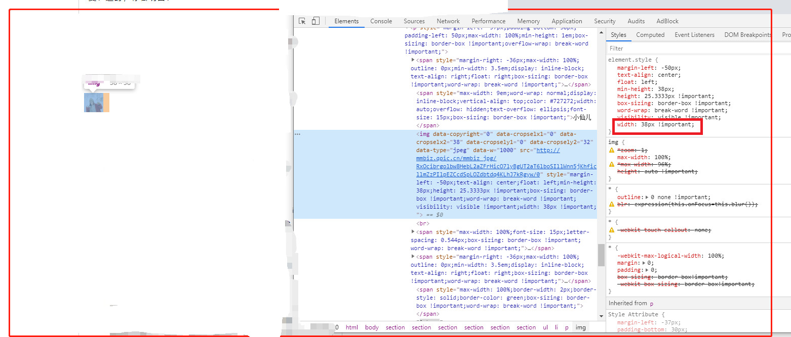 举例: img标签 style="width: 48px !important;" 通过 新增永久图文素材接口上传到公众号后, 再通过 获取永久素材接口获取的永久链接进行访问,发现 img标签被替换成 style="width:auto !important; height: auto !important;" 请求解答!