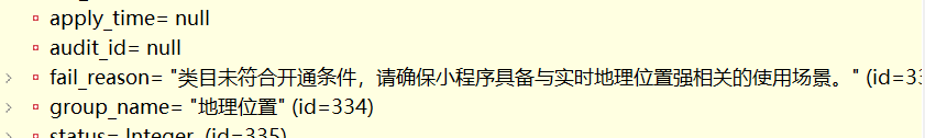 {"errcode":0,"errmsg":"ok","interface_list":[{"api_name":"wx.chooseAddress","api_ch_name":"wx.chooseAddress","api_desc":"获取用户收货地址","status":2,"fail_reason":"类目未符合开通条件,请确保小程序具备与实时地理位置强相关的使用场景。","api_link":"https:\/\/developers.weixin.qq.com\/miniprogram\/dev\/api\/open-api\/address\/wx.chooseAddress.html","group_name":"地理位置"},{"api_name":"wx.startLocationUpdate","api_ch_name":"wx.startLocationUpdate","api_desc":"开启小程序进入前台时接收位置消息","status":2,"fail_reason":"类目未符合开通条件,请确保小程序具备与实时地理位置强相关的使用场景。","api_link":"https:\/\/developers.weixin.qq.com\/miniprogram\/dev\/api\/location\/wx.startLocationUpdate.html","group_name":"地理位置"},{"api_name":"wx.onLocationChange","api_ch_name":"wx.onLocationChange","api_desc":"监听实时地理位置变化事件","status":2,"fail_reason":"类目未符合开通条件,请确保小程序具备与实时地理位置强相关的使用场景。","api_link":"https:\/\/developers.weixin.qq.com\/miniprogram\/dev\/api\/location\/wx.onLocationChange.html","group_name":"地理位置"},{"api_name":"wx.choosePoi","api_ch_name":"wx.choosePoi","api_desc":"打开 POI 列表选择位置","status":2,"fail_reason":"类目未符合开通条件,请确保小程序具备与实时地理位置强相关的使用场景。","api_link":"https:\/\/developers.weixin.qq.com\/miniprogram\/dev\/api\/location\/wx.choosePoi.html","group_name":"地理位置"},{"api_name":"wx.getFuzzyLocation","api_ch_name":"wx.getFuzzyLocation","api_desc":"获取当前的模糊地理位置","status":2,"fail_reason":"类目未符合开通条件,请确保小程序具备与实时地理位置强相关的使用场景。","api_link":"https:\/\/developers.weixin.qq.com\/miniprogram\/dev\/api\/location\/wx.getFuzzyLocation.html","group_name":"地理位置"},{"api_name":"wx.getLocation","api_ch_name":"wx.getLocation","api_desc":"获取当前的地理位置、速度","status":2,"fail_reason":"类目未符合开通条件,请确保小程序具备与实时地理位置强相关的使用场景。","api_link":"https:\/\/developers.weixin.qq.com\/miniprogram\/dev\/api\/location\/wx.getLocation.html ","group_name":"地理位置"},{"api_name":"wx.startLocationUpdateBackground","api_ch_name":"wx.startLocationUpdateBackground","api_desc":"开启小程序进入前后台时均接收位置消息","status":2,"fail_reason":"类目未符合开通条件,请确保小程序具备与实时地理位置强相关的使用场景。","api_link":"https:\/\/developers.weixin.qq.com\/miniprogram\/dev\/api\/location\/wx.startLocationUpdateBackground.html","group_name":"地理位置"},{"api_name":"wx.chooseLocation","api_ch_name":"wx.chooseLocation","api_desc":"打开地图选择位置","status":2,"fail_reason":"类目未符合开通条件,请确保小程序具备与实时地理位置强相关的使用场景。","api_link":"https:\/\/developers.weixin.qq.com\/miniprogram\/dev\/api\/location\/wx.chooseLocation.html","group_name":"地理位置"}]}