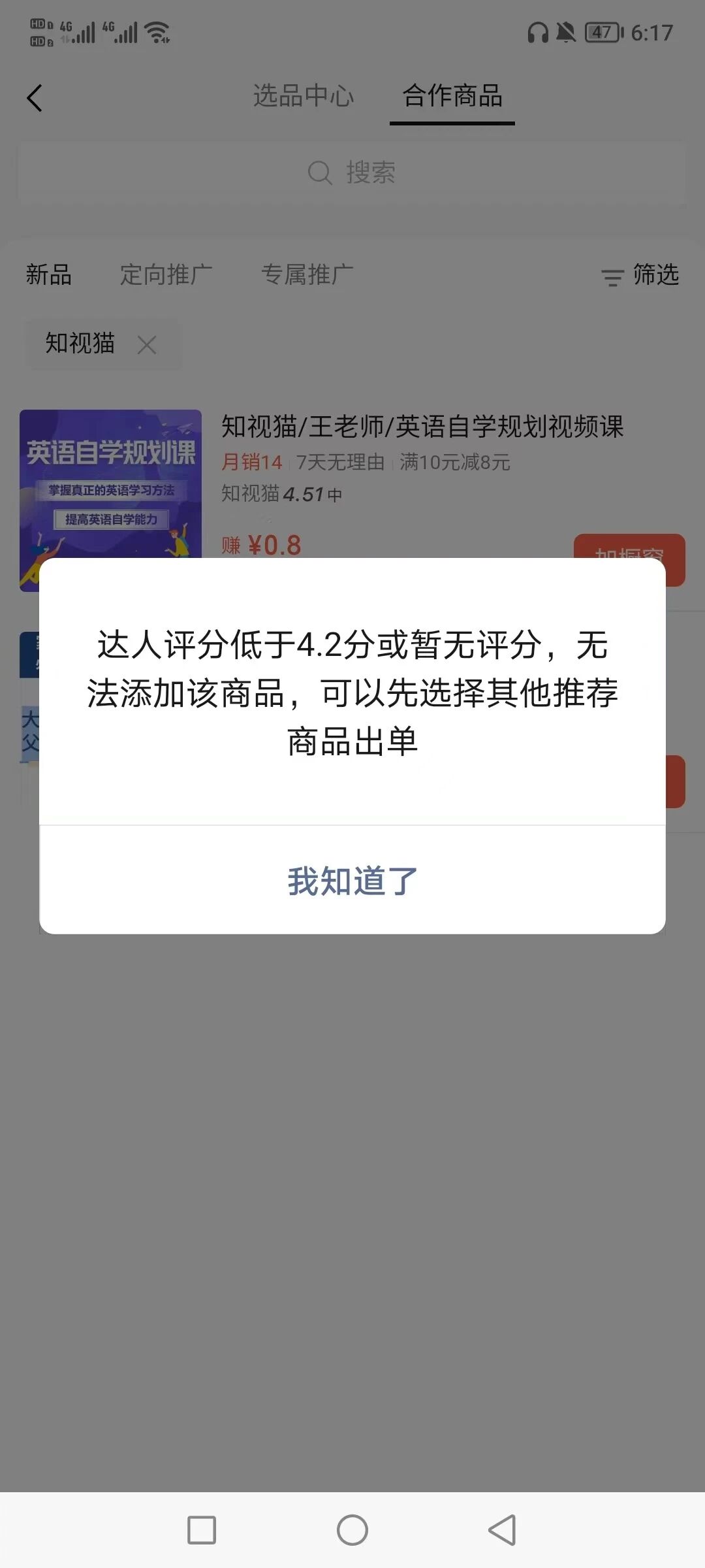 达人评分低于4.2分或暂无评分,无法添加该商品,可以先选择其他推荐商品出单