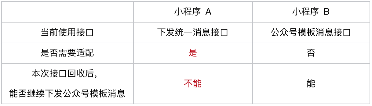 2、本次接口回收仅影响使用旧的下发统一消息接口的方式下发模板消息的情况,不代表公众号模板消息能力被收回,使用 公众号模板消息接口 下发公众号模板消息的能力不受影响。例如小程序 A、B 当前正使用不同接口下发公众号模板消息: