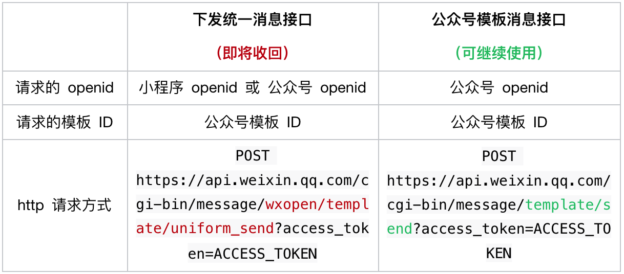1、下发统一消息接口与公众号模板消息接口的差异对比如下: