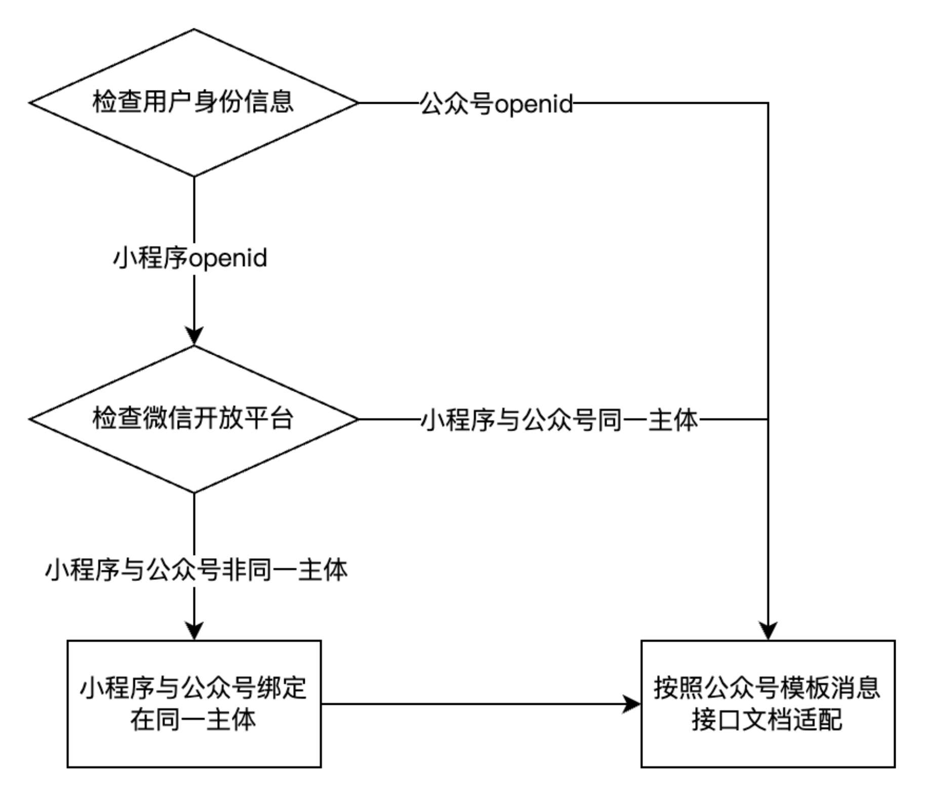 b) 若小程序与公众号没有绑定在同一个主体下,先完成绑定工作,再按照 公众号模板消息接口文档 适配