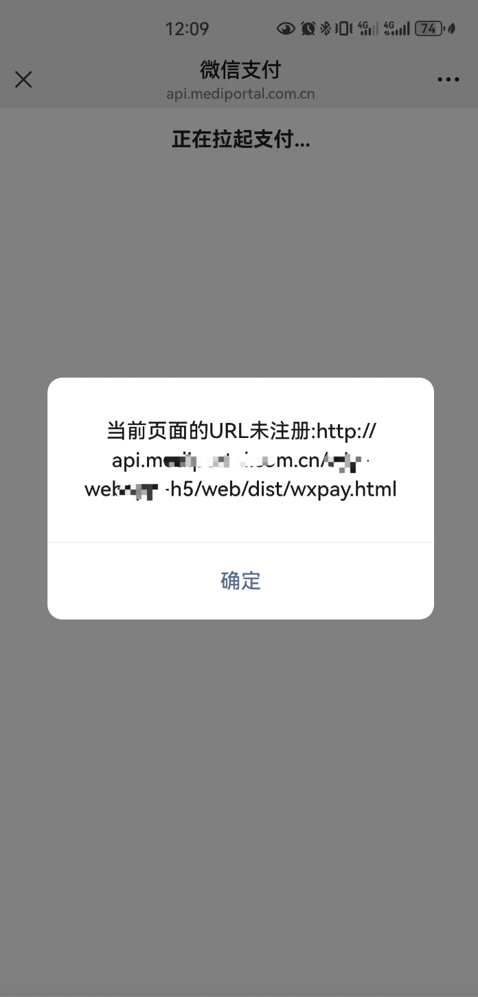 我们线上的h5大部分用户都能正常支付,今天收到了一个用户反馈,她在微信内部打开我们自己开发的h5页面去支付的时候,提示:当前页面的URL未注册:http://api.medi******.com.cn/***-web***-h5/web/dist/wxpay.html