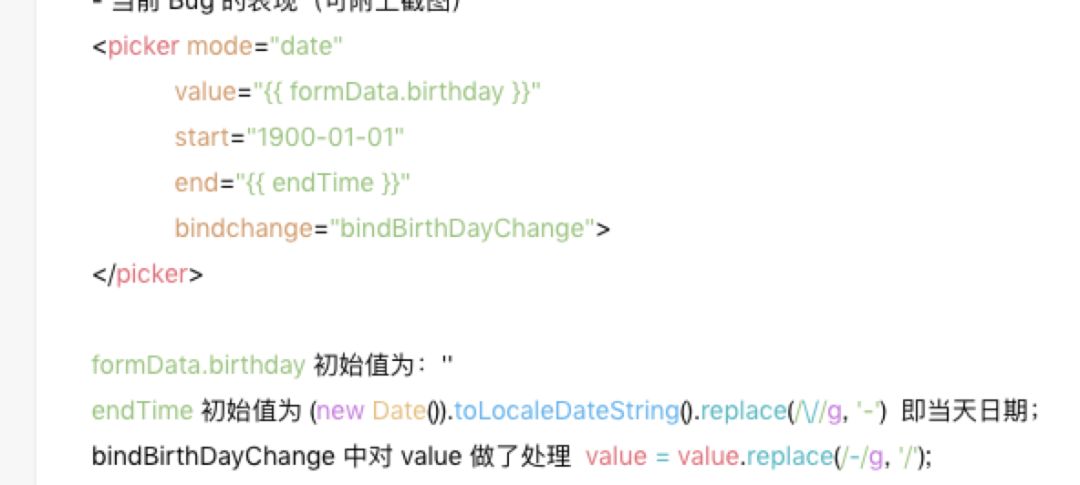 bindBirthDayChange 中对 value 做了处理 value = value.replace(/-/g, '/');