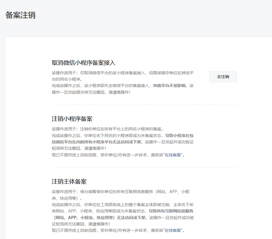微信小程序主体变更后,提示要重新备案,但是直接变更显示【不允许变更备案主体】,所以这个到底是要选【取消微信小程序备案接入】还是【注销小程序备案】?还有就是重新备案期间,小程序还可以正常使用不?