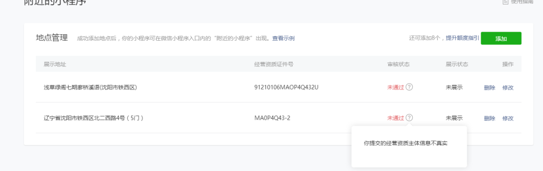 审核地址与营业执照地址都是一致的,为什么提示经营资质主体不真实。天眼查都可以查询到我们公司的地址的。。