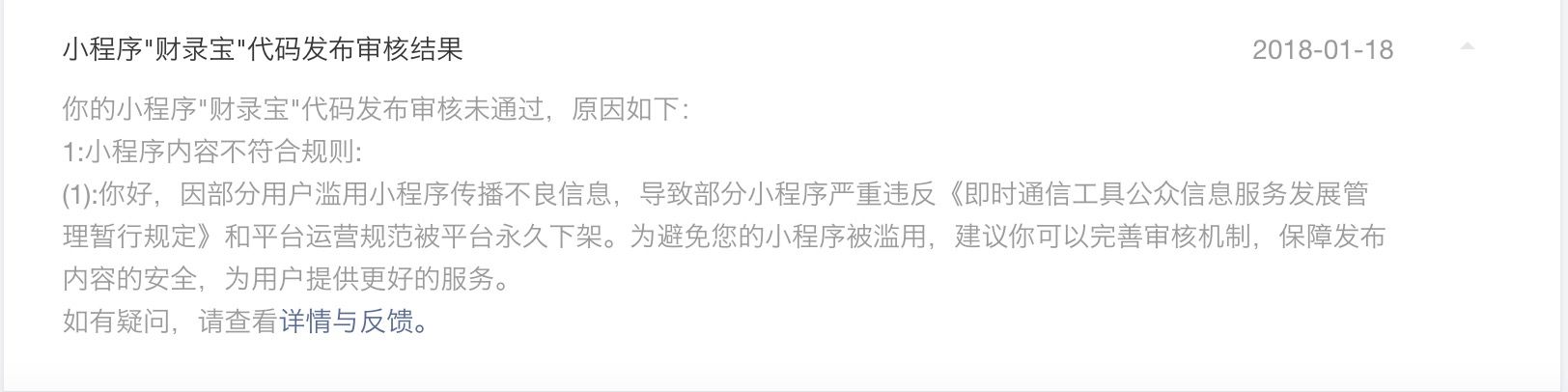 审核团队您们好:我公司开发的小程序于2018年1月17日提交第一次审核,于1月18日晚第一次审核不通过,审核不通过错误理由如下: