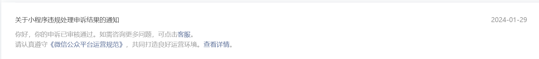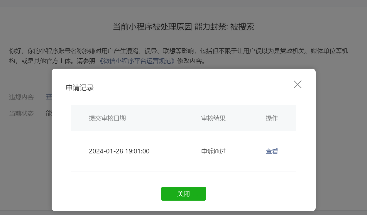经核实 小程序为正常使用状态 之前的处罚已解除