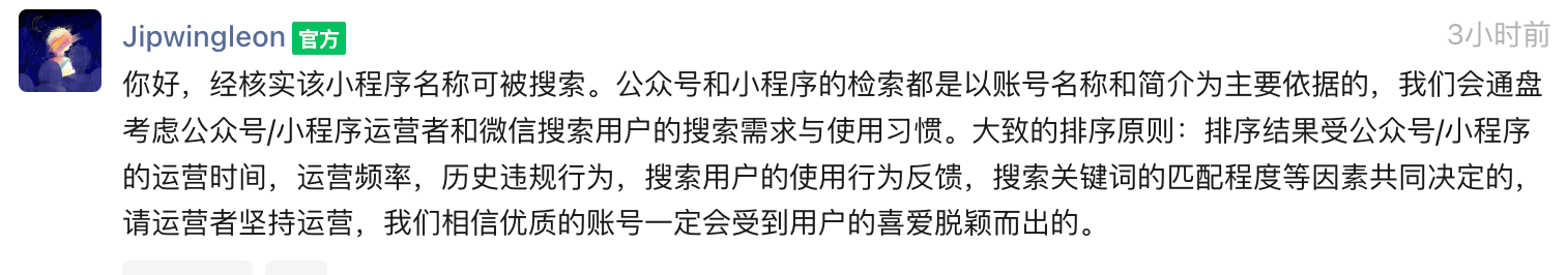 1月28日小程序被用户恶意投诉封禁搜索功能,后申诉成功,系统提示搜索功能将被恢复,但4天过去了,仅恢复了精准搜索功能,模糊搜索并未恢复。在1月28日之前,小程序一直运营正常,支持模糊搜索,如今模糊搜索却不见了。
