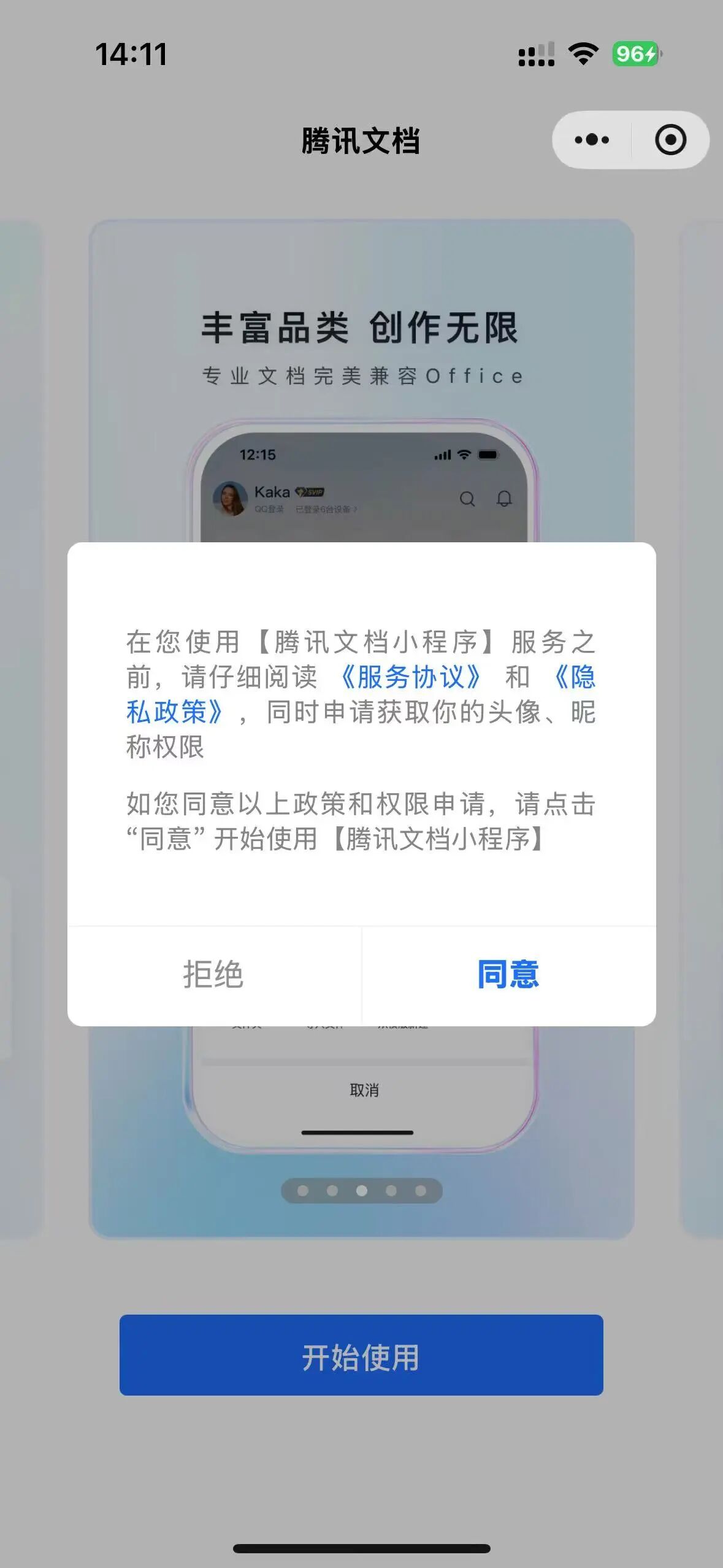 我在设计小程序登录流程时,参考了 腾讯文档小程序 的登录方式,具体交互如下: