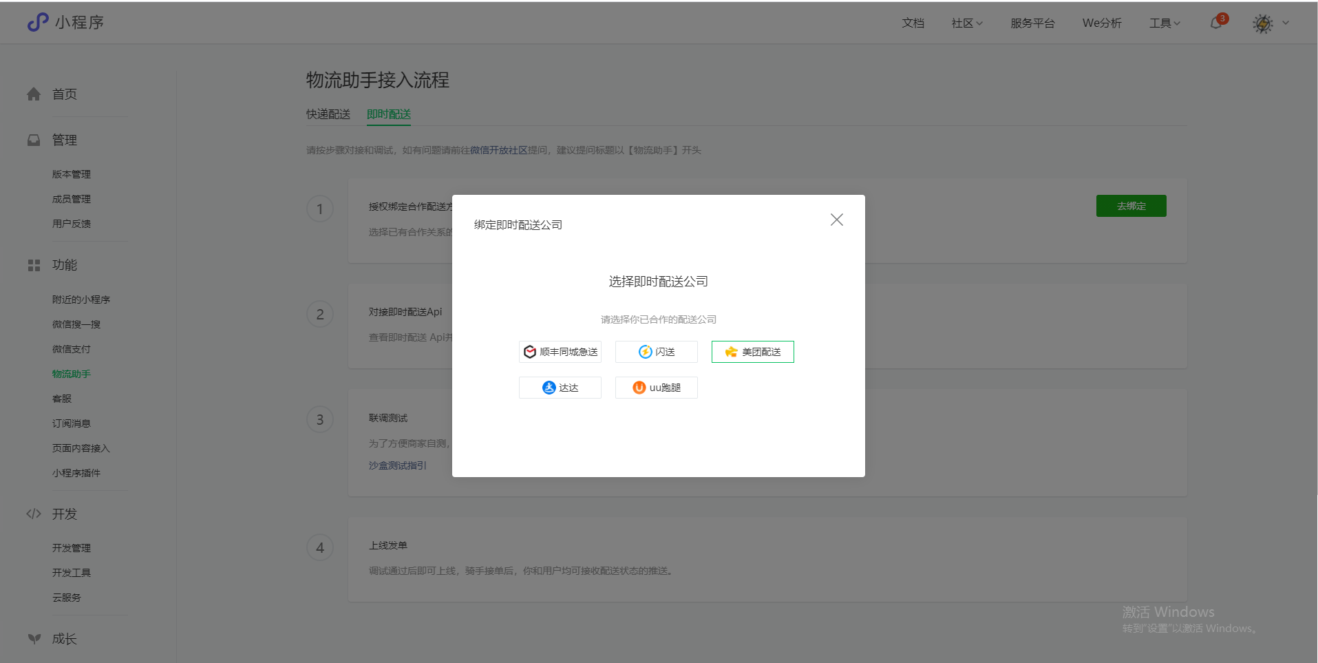 【物流助手】绑定即时配送公司时. 美团提示" 授权失败,该账号尚无对应合作方" 如何处理?