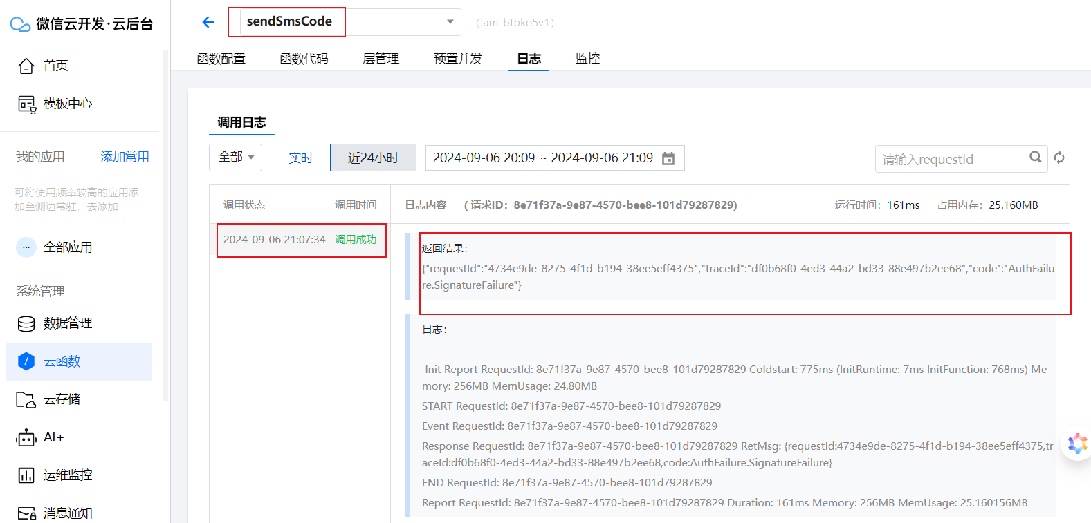 4、从云开发云后台查看,函数调用成功,但提示签名错误"code":"AuthFailure.SignatureFailure",如下图: