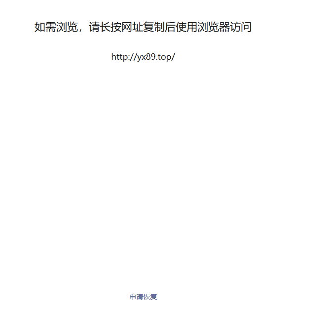 域名链接:【外链咨询】从微信打开网址提示:yx89.top 问题描述: 我们的网站在微信内打开时,提示“如需浏览,请长按网址复制后使用浏览器访问”。我们的网站已完全合规合法,内容不涉及违规信息,但依然被微信拦截。请协助核查具体原因并提供解决方案。下面是网站的内容截图。 @社区技术运营