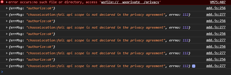{errMsg: "chooseLocation:fail api scope is not declared in the privacy agreement", errno: 112}