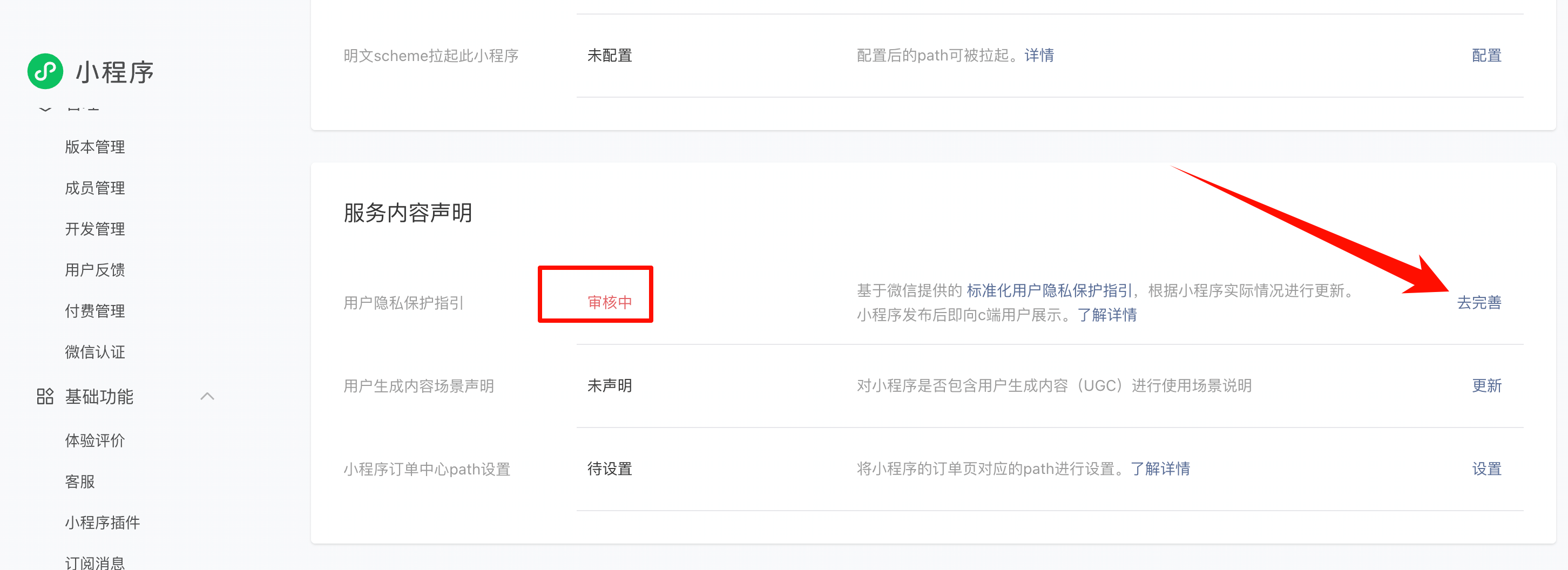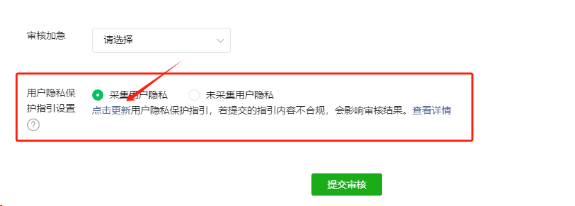 隐私保护指引,检查一下线上版本,在提交审核的按钮上方,点击更新查看