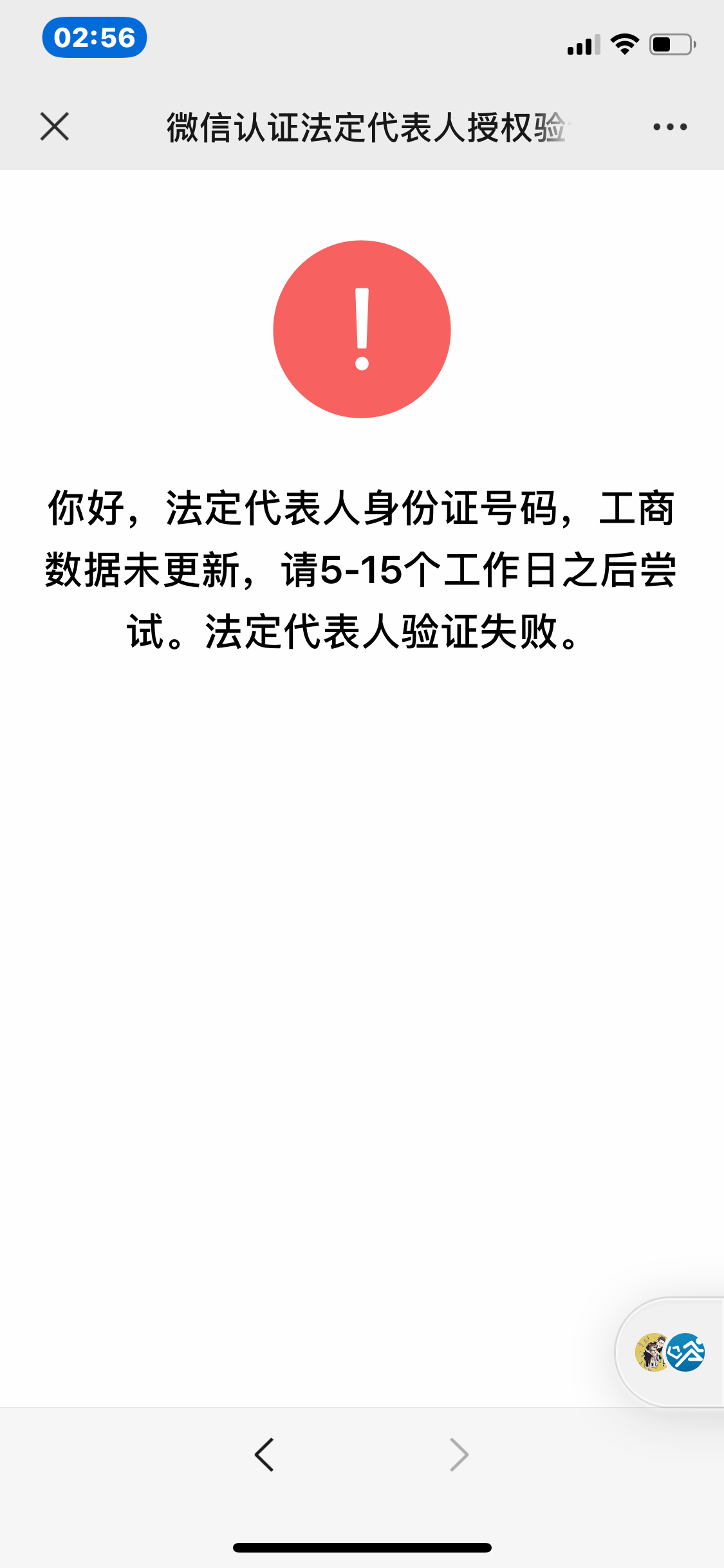 营业执照已经下来三个月了,之前三月份申请公众号都没问题,现在五月了怎么出了问题!!!!你好,法定代表人身份证号码,工商数据未更新,请5-15个工作日之后尝试。法定代表人验证失败。麻烦客服大大帮着检查下我是否有填写错误及该怎么处理后续问题。原始ID:gh_6625d26e852b,登录账号:su19904101123@163.com