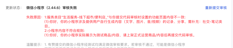你好,经核实,你的小程序确实涉及提供用户自行生成内容(文字、图片、音/视频)的记录、分享,需补充:社交-笔记类目。或自查代码,确保包括前端展示、小程序代码等整体均移除:相关内容,再提交代码审核。(详图如下)