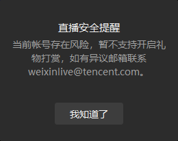 个人视频号直播,播了几天都是正常的,今天一开播就弹出这个提示,请问要怎么解决?视频号也没私信提示。