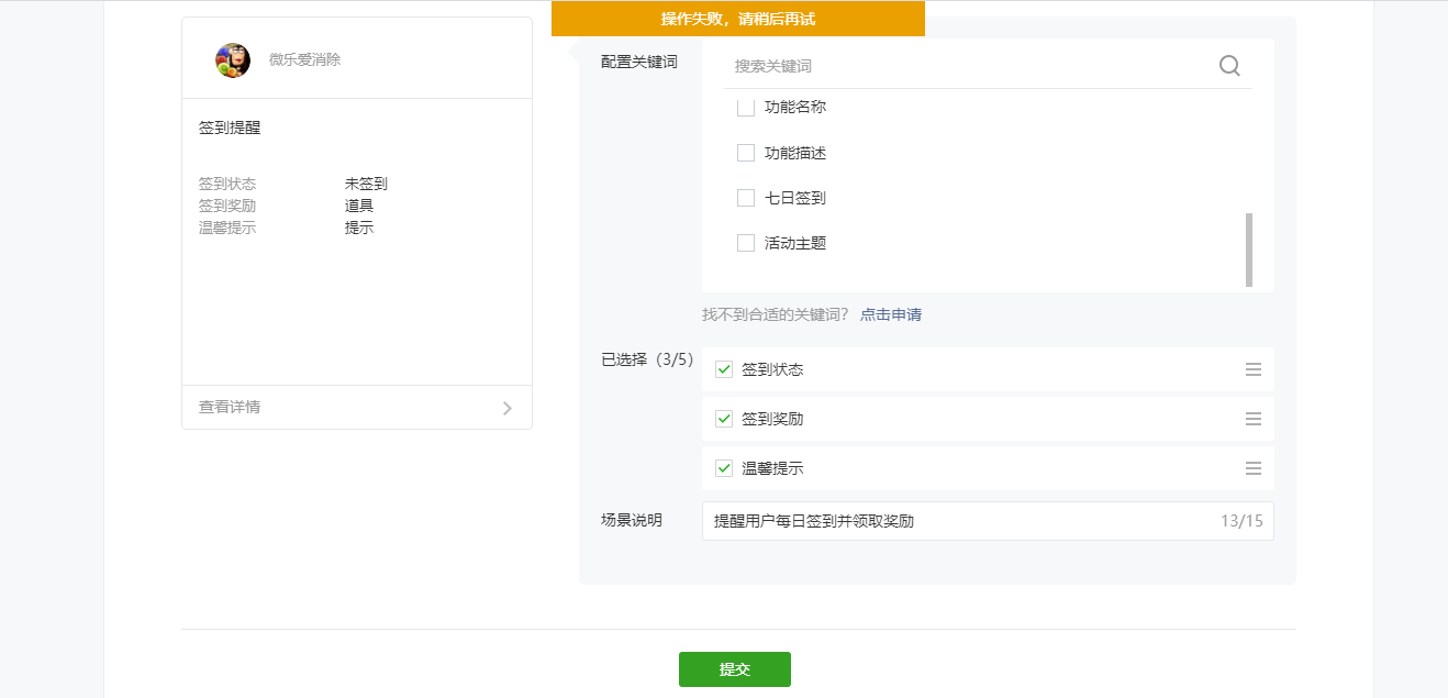 小程序申请订阅消息,点击“提交“按钮,提示操作失败,请稍后重试,请问是什么问题?