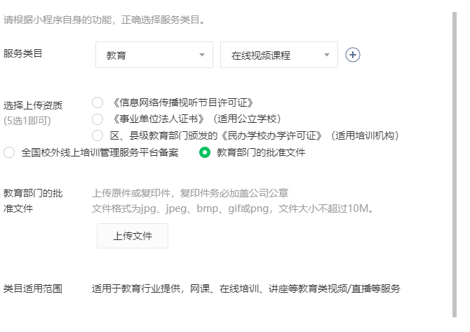 请参考官方文档中的资质示例:https://developers.weixin.qq.com/miniprogram/product/material/jiaoyu/zaixianshipinkecheng1.html