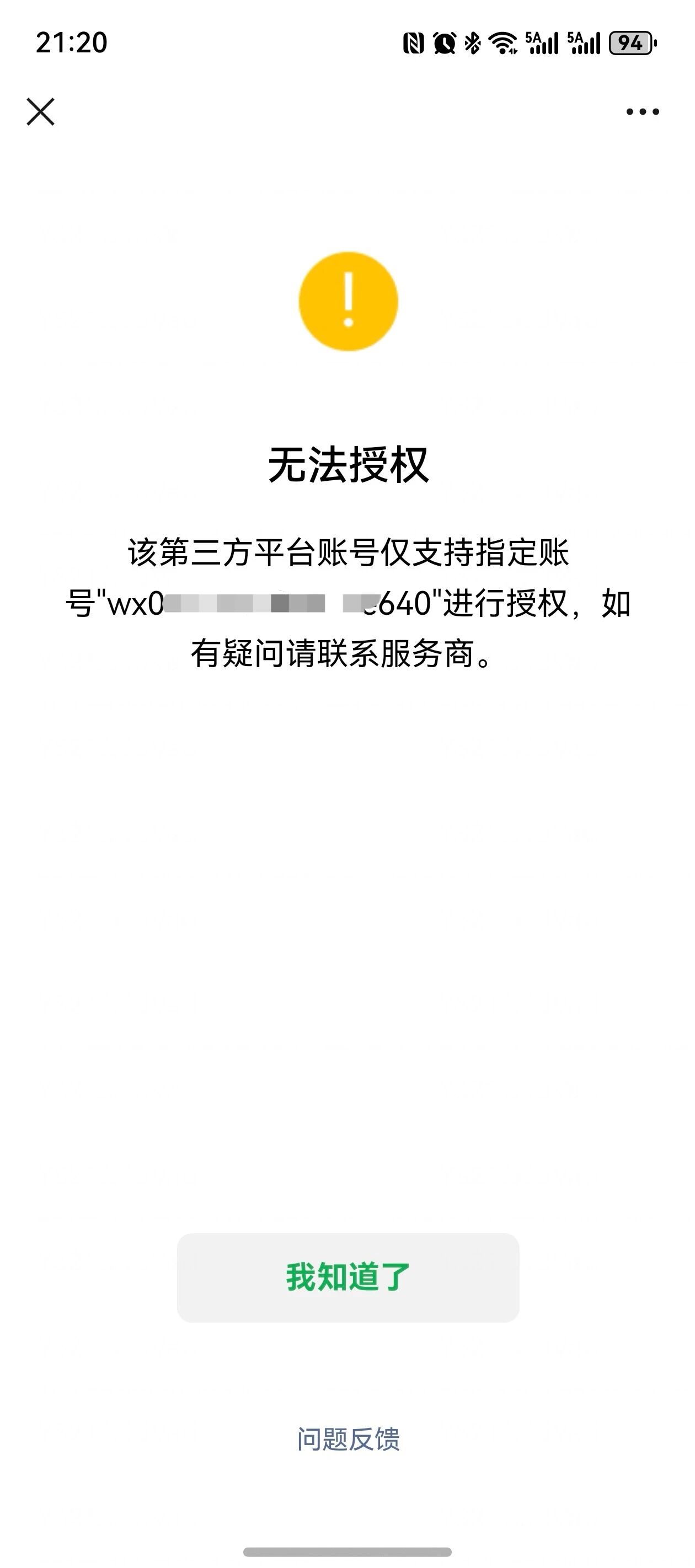 你好,请参考 https://developers.weixin.qq.com/doc/oplatform/Third-party_Platforms/2.0/troubleshooting/authorization_troubleshooting.html#%E4%BA%94%E3%80%81%E5%95%86%E5%AE%B6%E6%8E%88%E6%9D%83%E6%8F%90%E7%A4%BA%E6%97%A0%E6%B3%95%E6%8E%88%E6%9D%83%E3%80%81%E6%97%A0%E8%B4%A6%E5%8F%B7 自助排查