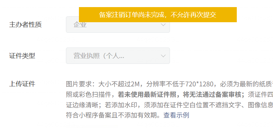 @社区技术运营专员--许涛 小程序wxf07b854b856a7d01 点击备案提示“备案注销订单尚未完成,不允许再次提交”