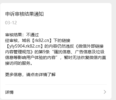 你好,经审核,域名rk82.cn下的链接【http://zyl8561.rk82.cn/?WoX=FQnL1OzIAouOggMQHmtm1g5qDx3oEFtqeaET88Ni】的违规内容已经修改,现已恢复微信内直接访问的服务,请知悉。