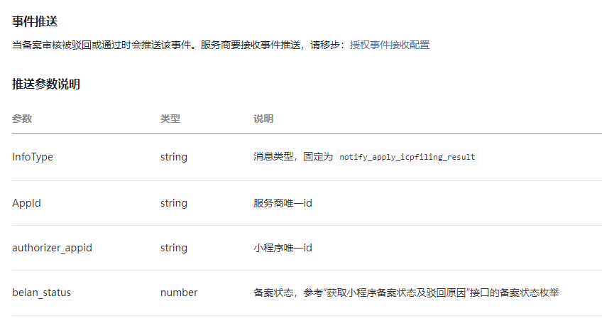 你好,当备案审核被驳回或通过时才会推送该事件。当备案进入平台初审中,不会推送消息。