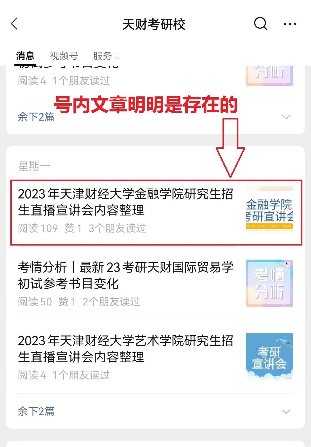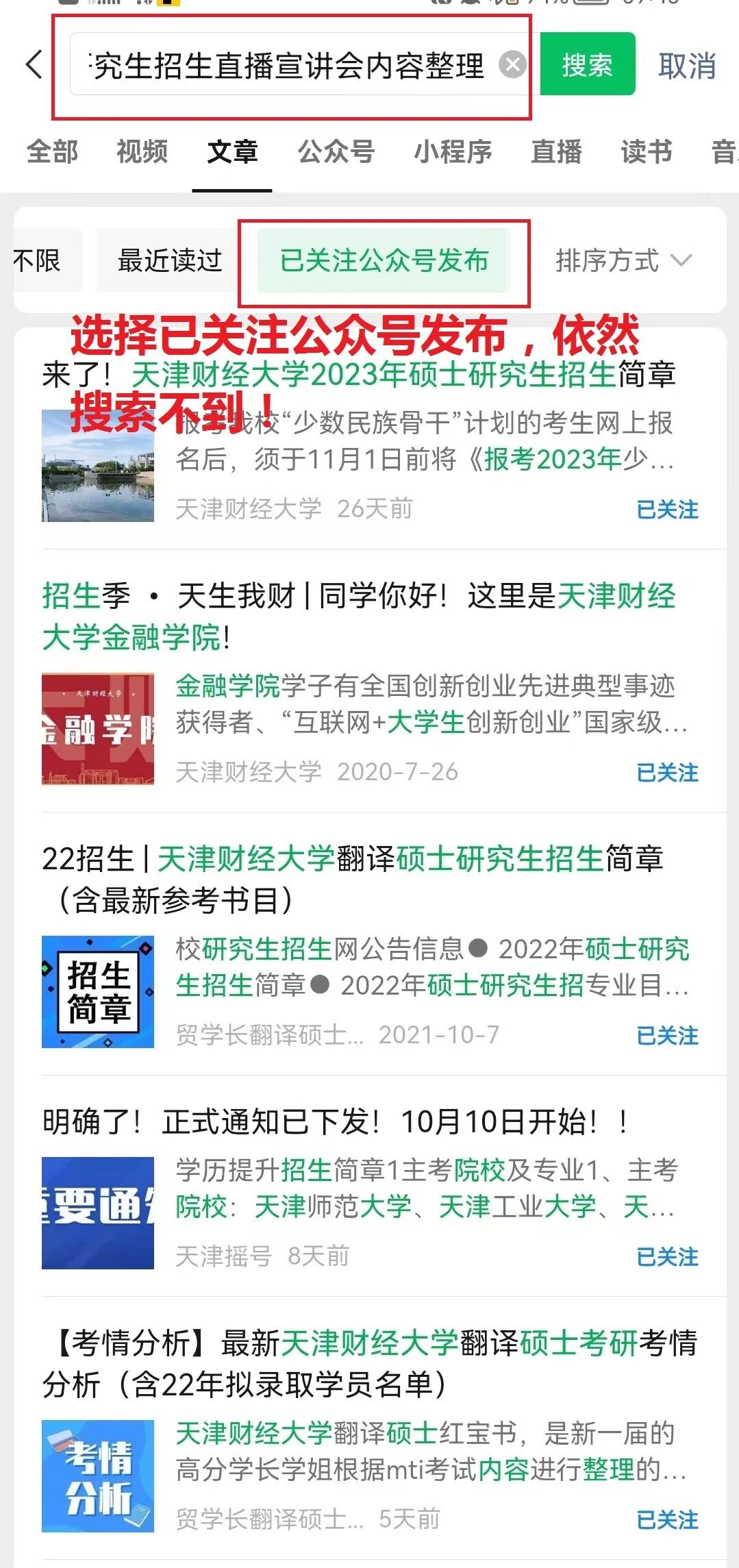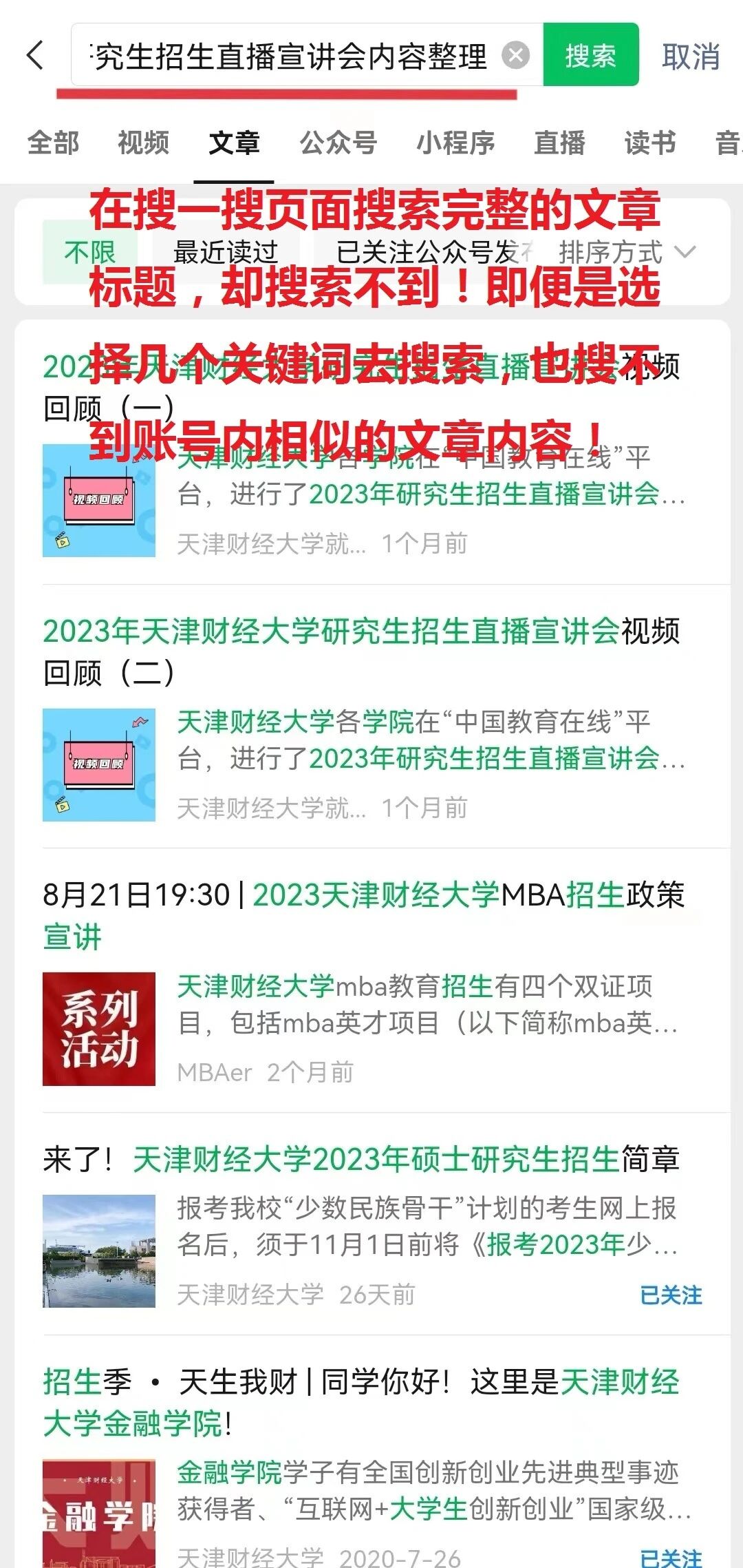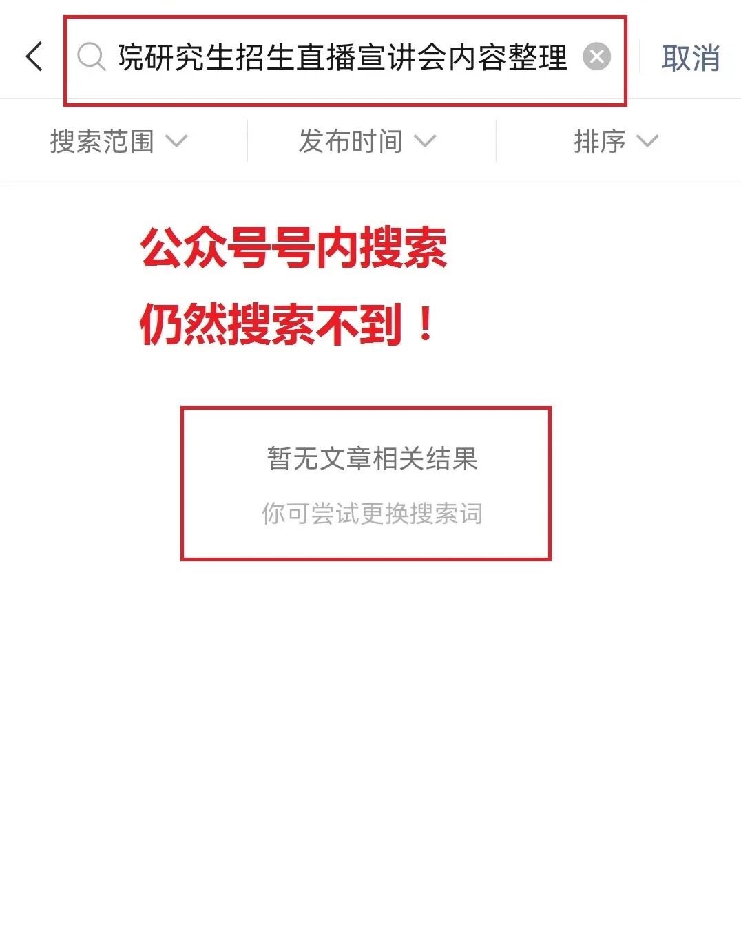 就以这篇推文为例,在已经关注该公众号的情况下,搜索完整的标题依然搜索不到,并且在本公众号号内搜索也搜索不到,号内所有的文章,搜索关键词、完整的标题完全搜不到内容!这种情况已经好几天了,快要emo了~